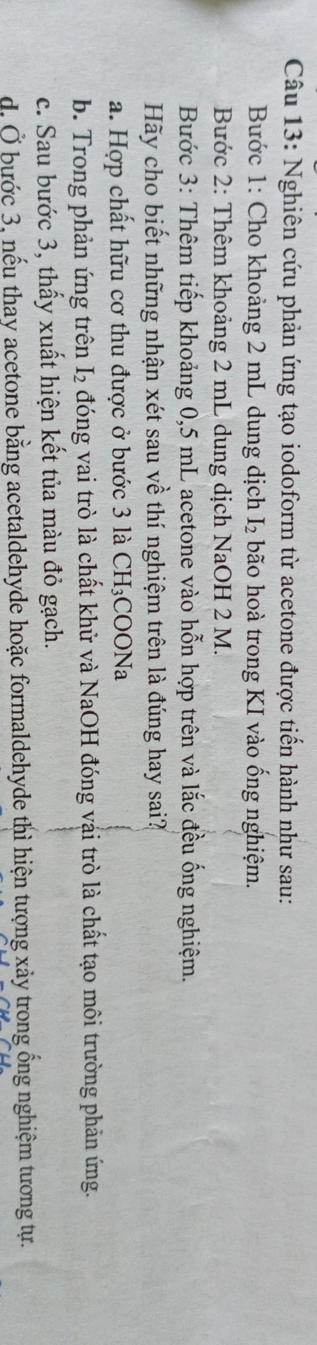c)Sai sau bước ba nhận kết tủa màu vàng nhạt của ($CHI_3$)