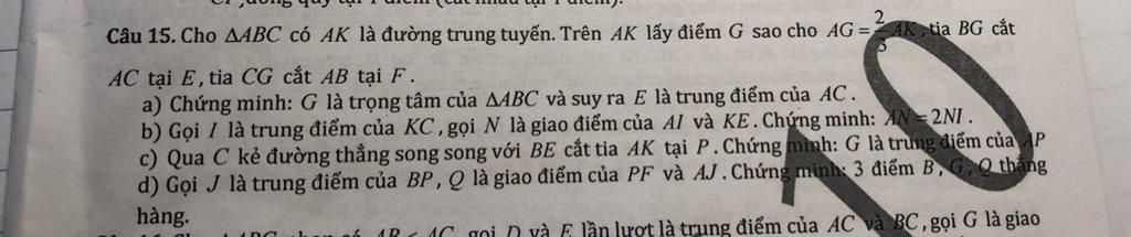 Câu 15. Cho A4BC có AK là đường trung tuyến. Trên AK lấy điểm G sao cho AG =~AK,tia BG cắt