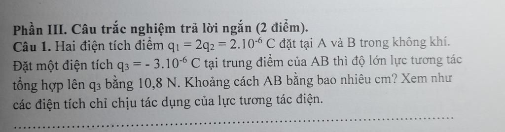 Vì Hai lực này không thẳng hàng (do q1 và q2 ở hai đầu AB, q3= ở giữa), nên phải dùng định lý Pytago để tính tổng hợp lực: F=√F=F12+F22=10.8N