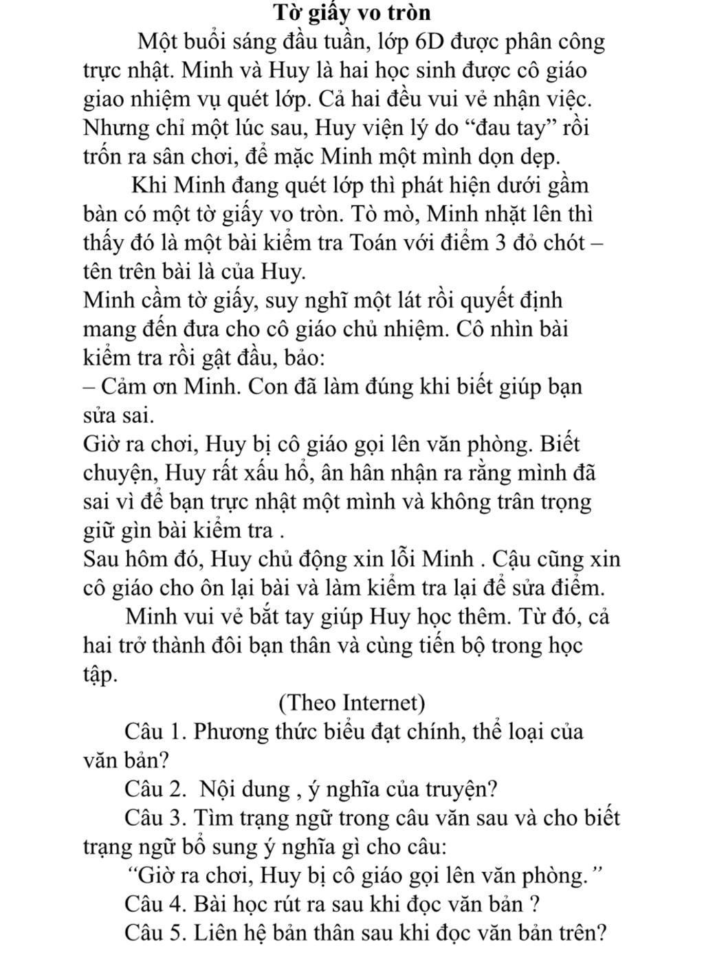 Truyện kể về một tình huống học đường đơn giản nhưng sâu sắc: Minh phát hiện bài kiểm tra của bạn Huy bị rơi, bạn ấy đã sai nhưng Minh vẫn quyết định giúp bạn. Câu truyện đề cao lòng trung thực, sự bao dung, tinh thần giúp đỡ nhau để sửa sai và quá trình tiến bộ.
