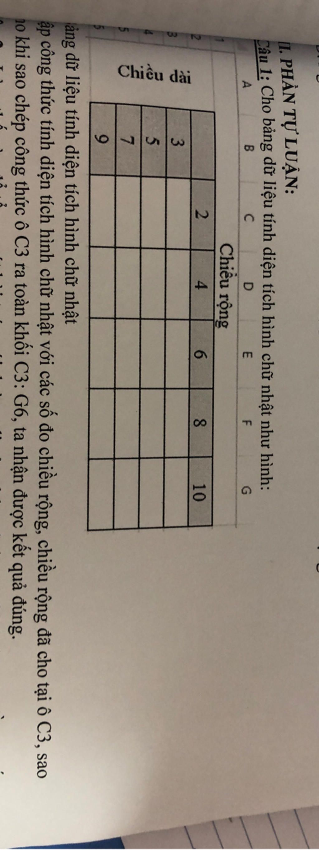 Câu 1: Cho bảng dữ liệu tính diện tích hình chữ nhật như hình: