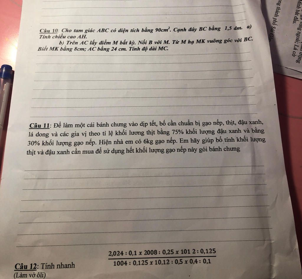 Câu 10: Cho tam giác ABC có diện tích bằng 90cm. Cạnh đáy BC bằng 1,5 dm. a)
