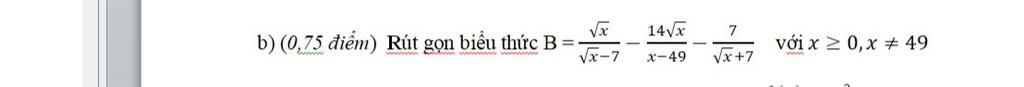 Khi đó, $B = \dfrac{\sqrt{x}}{\sqrt{x}-7} - \dfrac{14\sqrt{x}}{x-49} - \dfrac{7}{\sqrt{x}+7}$