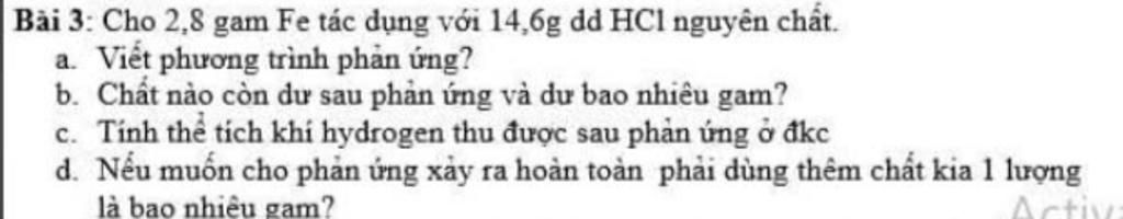 Ta có tỉ lệ phản ứng 1Fe:2HCl