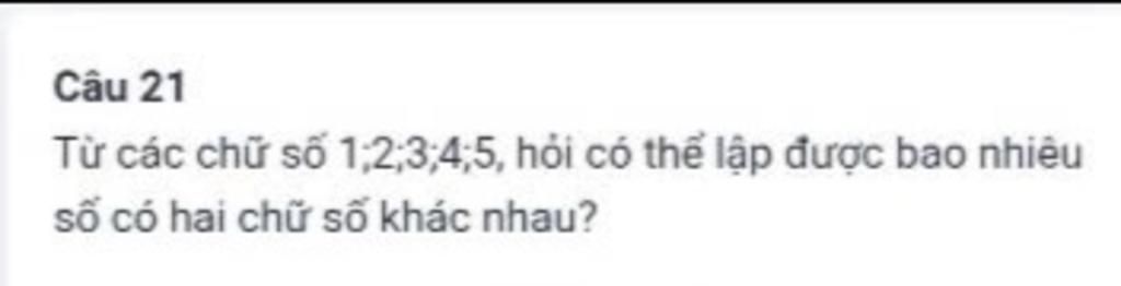 Vậy có thể lập được `20` số có hai chữ số khác nhau từ các chữ số `1;2;3;4;5`.