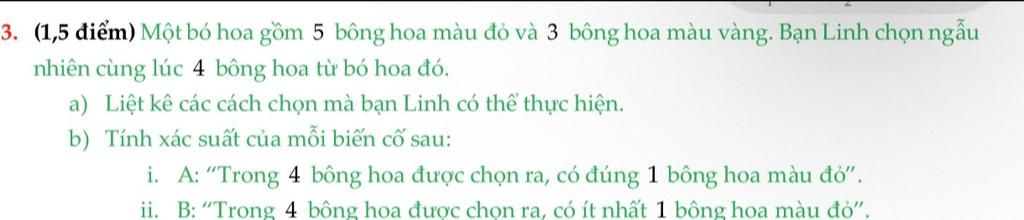 $\text{b) A: “Có đúng 1 bông hoa đỏ" }$