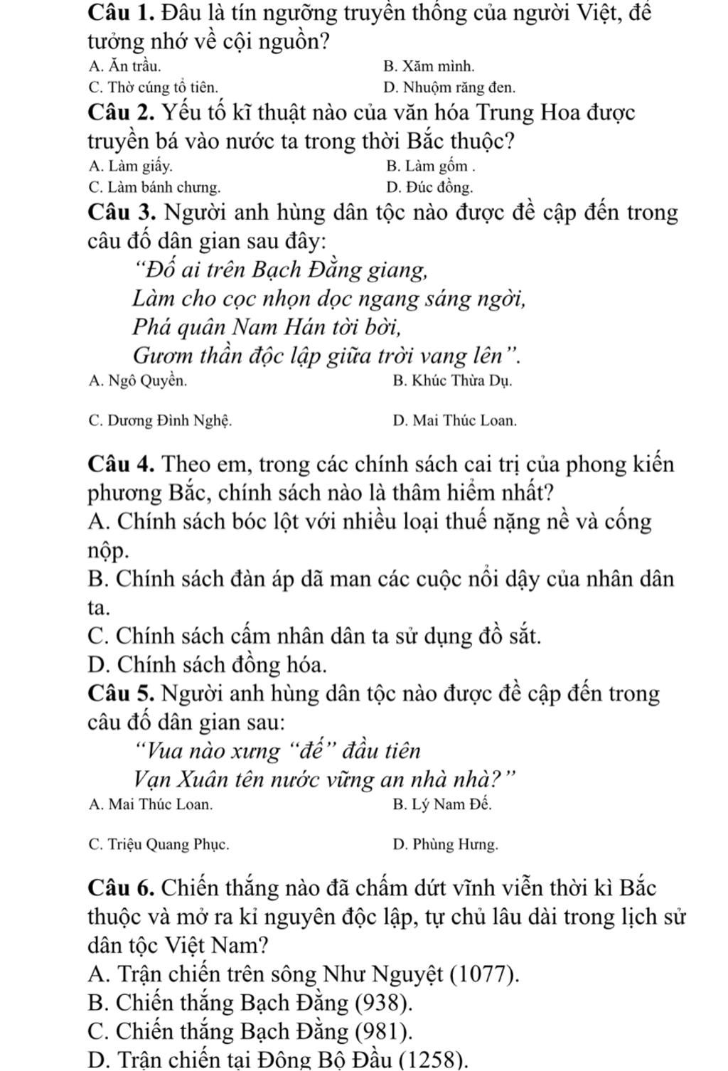 ⋆。°Giải thích°。⋆: Chiến thắng Bạch Đằng năm 938 do Ngô Quyền lãnh đạo đánh tan quân Nam Hán đã chấm dứt hơn 1000 năm Bắc thuộc, mở ra thời kỳ độc lập, tự chủ lâu dài cho dân tộc ta.