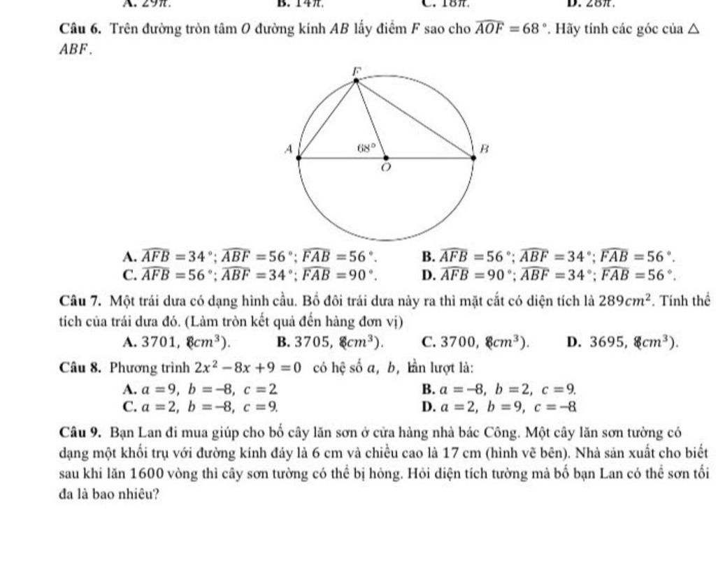 Câu 6. Trên đường tròn tâm 0 đường kính AB lấy điểm F sao cho AOF =68". Hãy tính các góc của A