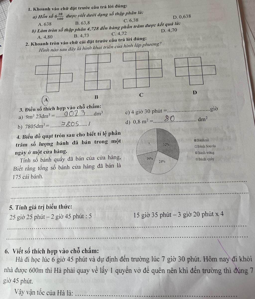 `175 × ( 100 - 32 - 24 - 16 ) : 100 = 49` ( cái bánh )