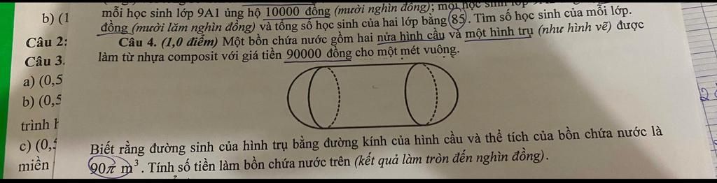 Thể tích bồn gồm hình trụ và hai nửa hình cầu (tức là 1 hình cầu):