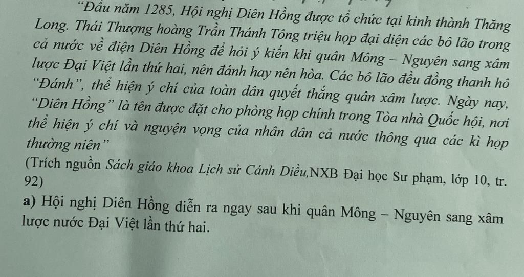 `a.` Hội nghị Diên Hồng diễn ra ngay sau khi quân Mông`-` Nguyên sang xâm lược nước Đại Việt lần thứ hai.