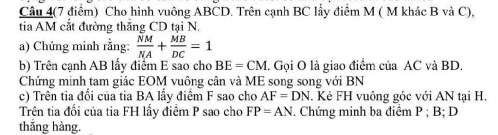 Câu 4(7 điểm) Cho hình vuông ABCD. Trên cạnh BC lấy điểm M ( M khác B và C),