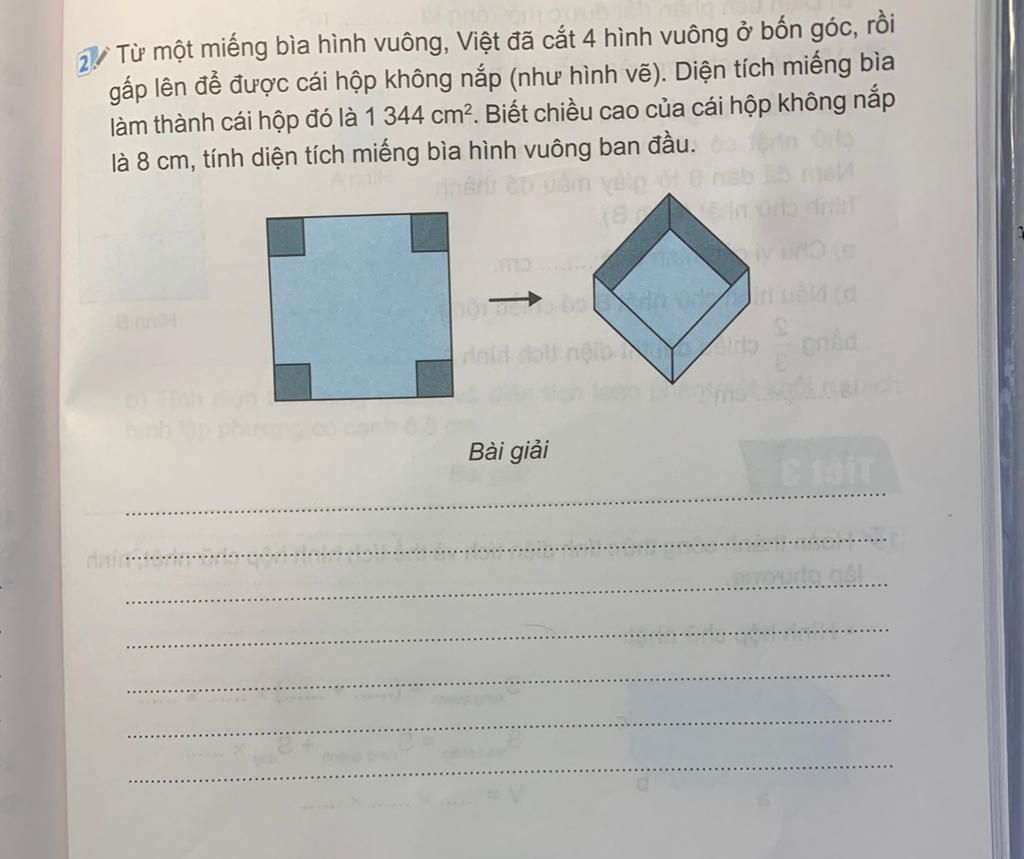 64 x 4=256 ($cm^{2}$ ) Diện tích miếng bìa hình vuông ban đầu đó là :