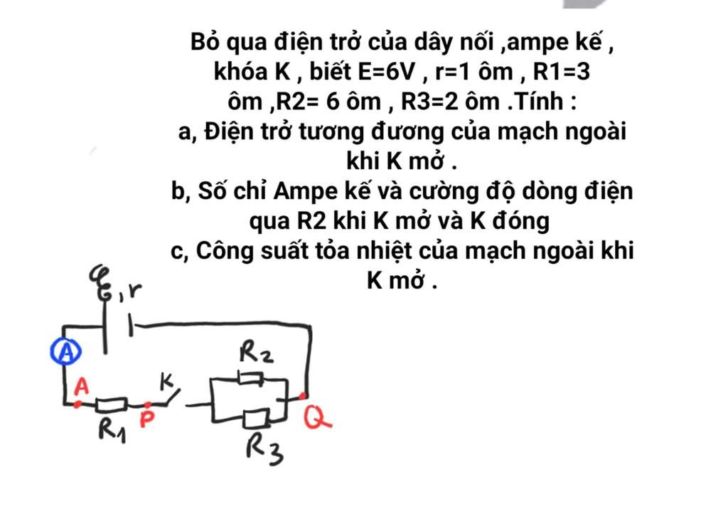 khóa K, biết E=6V, r=1 ôm, R1=3