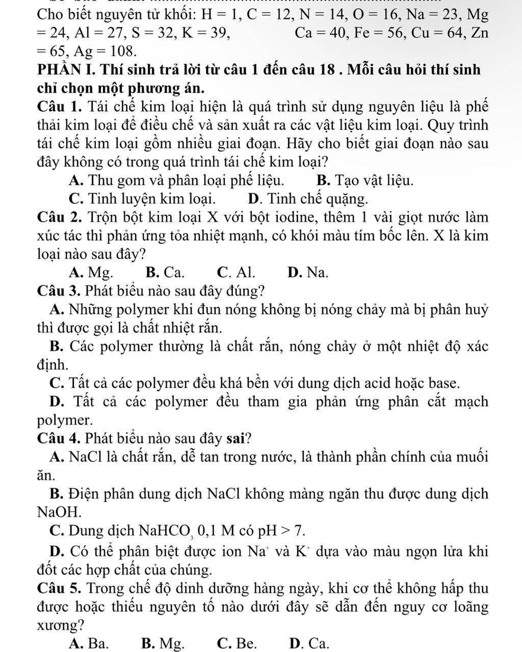 Câu 1: D. Vì là quá trình tái chế nên không cần xuất phát từ quặng nữa