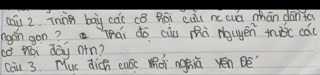 Câu 2: Trình bày các cơ hội cứu nước của nhân dân ta ngắn gọn? Thái độ của nhà Nguyễn trước các cơ hội đó như thế nào?