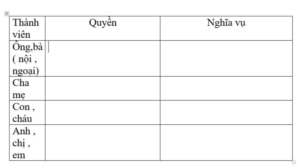 \begin{array}{|c|c|c|} \hline \textbf{Thành viên} & \textbf{Quyền} & \textbf{Nghĩa vụ} \\ \hline \text{Ông, bà (nội, ngoại)} & \text{Được con cháu kính trọng, yêu thương, chăm sóc khi già yếu} & \text{Nêu gương đạo đức, truyền dạy kinh nghiệm sống cho con cháu} \\ \hline \text{Cha mẹ} & \text{Được con cái yêu thương, kính trọng, chăm sóc khi ốm đau, tuổi già} & \text{Nuôi dưỡng, dạy dỗ con cái trở thành người tốt, công dân có ích} \\ \hline \text{Con, cháu} & \text{Được cha mẹ, ông bà yêu thương, chăm sóc, giáo dục} & \text{Kính trọng, yêu thương, giúp đỡ và chăm sóc ông bà, cha mẹ} \\ \hline \text{Anh, chị, em} & \text{Được yêu thương, chia sẻ, giúp đỡ lẫn nhau trong cuộc sống} & \text{Yêu thương, đoàn kết, giúp đỡ lẫn nhau, cư xử hòa thuận trong gia đình} \\ \hline\end{array}