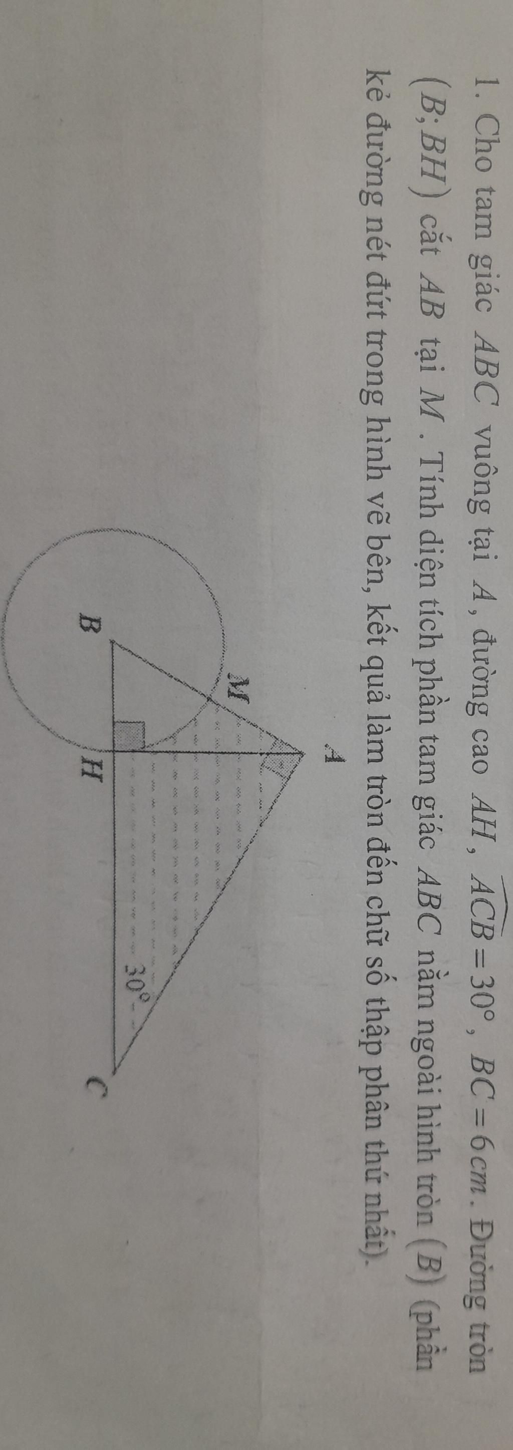 (B;BH) cắt AB tại M . Tính diện tích phần tam giác ABC nằm ngoài hình tròn (B) (phần