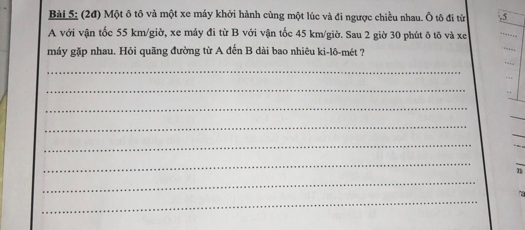 Đề bài: Một ô tô và một xe máy khởi hành cùng một lúc và đi ngược chiều nhau. Ô tô đi từ A với vận tốc 55 km/giờ, xe máy đi từ B với vận tốc 45 km/giờ. Sau 2 giờ 30 phút ô tô và xe máy gặp nhau. Hỏi quãng đường từ A đến B dài bao nhiêu km ?