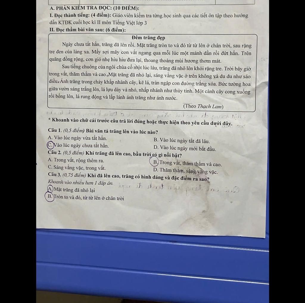 Câu 3: Trăng đã lên cao, có hình dáng, đặc điểm là: mặt trăng nhỏ lại, sáng vằng vặc ở trên không, du du như sáo diều