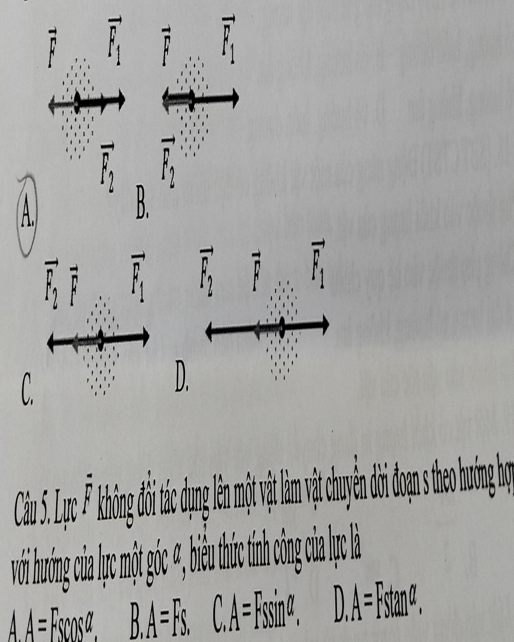 Công của một lực ` \vec{F}`khi vật chuyển dời một đoạn `s`, hợp với lực một góc $\alpha$ được tính theo công thức: