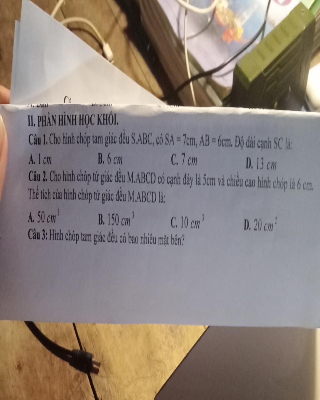 `@` Hình chóp tam giác đều có `3` mặt bên là các tam giác cân bằng nhau và mặt đáy là tam giác đều.
