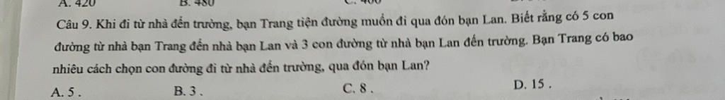 `\Rightarrow` Vậy để đi từ nhà bạn Trang đến trường, qua đón bạn Lan thì ta có: $5*3=\boxed{15}$ (cách chọn)