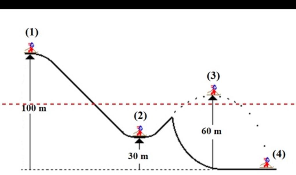 Một vận động viên trượt ván từ vị trí (1) trên đỉnh dốc trượt xuống vị trí (2), sau đó thực hiện một cú nhảy qua vị trí (3) và đáp xuống mặt đất ở vị trí (4) như hình 8. Biết người này nặng 50 kg. Lấy g=9,8 m/s2. Chọn mặt đất làm gốc thế năng và chiều dương hướng thẳng đứng lên trên.