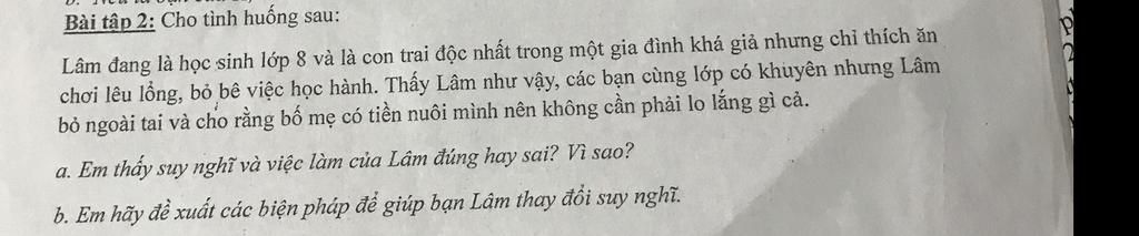 `a`. Theo em, suy nghĩ và việc làm của Lâm là sai. Tuy Lâm mới học lớp `8` và sống trong gia đình khá giả nhưng lại ăn chơi, không lo học hành. Mặc dù được mấy bạn khuyên ngăn nhưng Lâm vẫn không nghe lời các bạn mà vẫn chứng nào tật nấy.