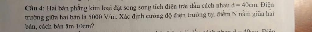 Điện trường giữa hai bản phẳng kim loại là điện trường đều nên cường độ điện trường tại điểm N hướng từ N đến bản âm và có độ lớn là $5000 V/m$.