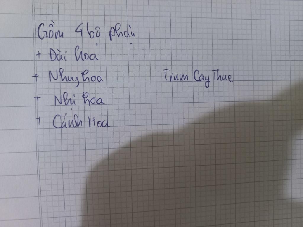 - Một hoa lưỡng tính có 4 bộ phận bao gồm : đài hoa , cánh hoa , nhị hoa , nhụy hoa.
