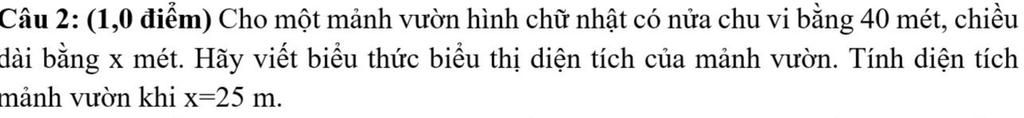 Biểu thức biểu thị diện tích mảnh vườn là: `x( 40 - x ) ( m^2 )`