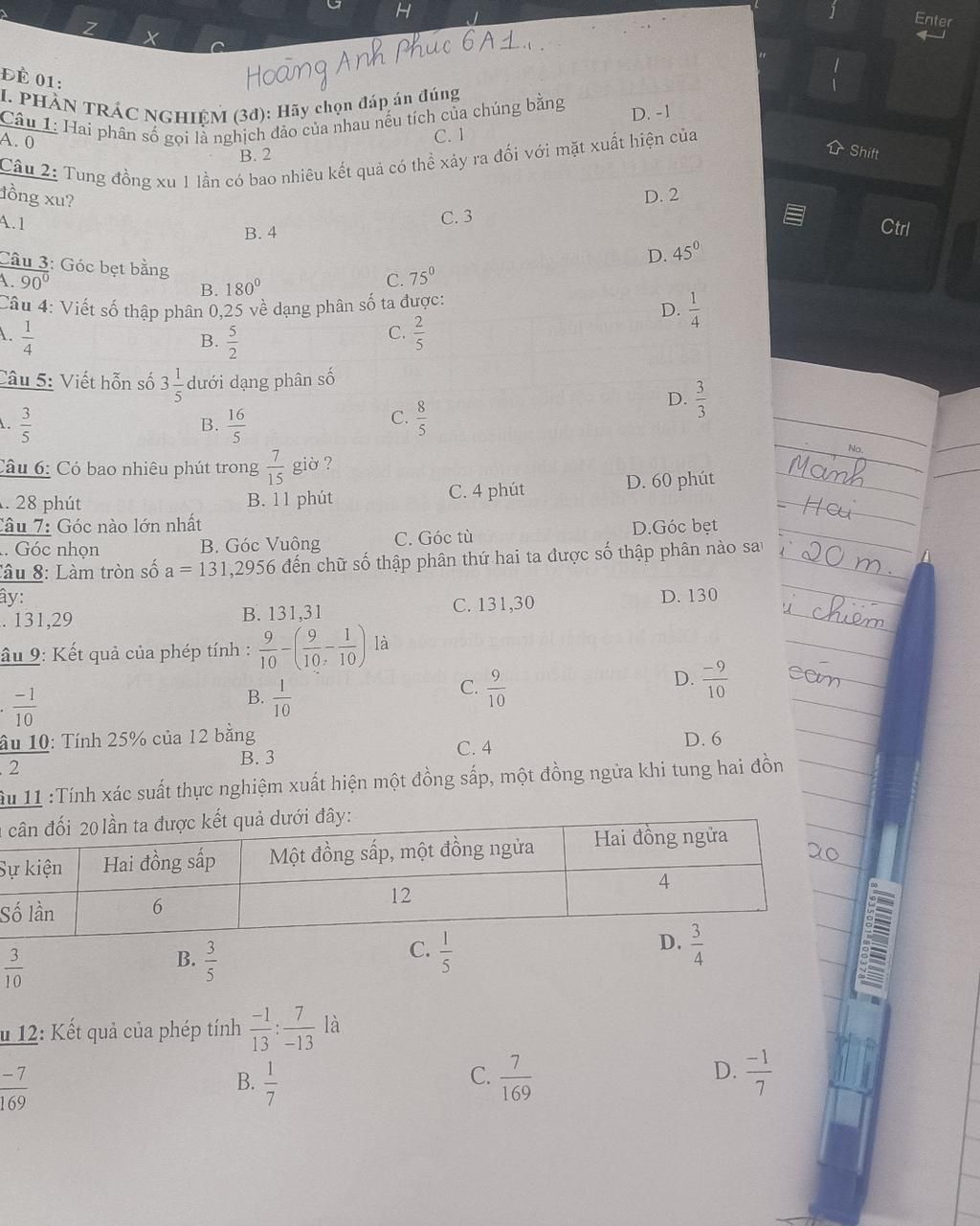 Câu 2: Tung đồng xu 1 lần có bao nhiêu kết quả có thể xảy ra đối với mặt xuất hiện của đồng xu?