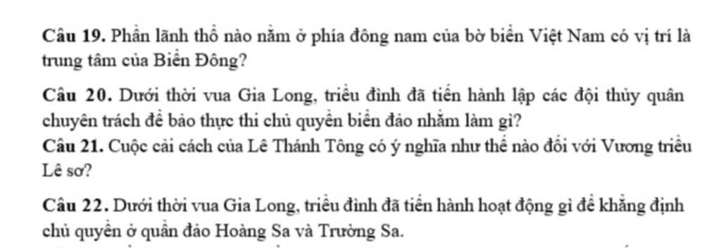 Câu 22: Dưới thời Gia Long, triều đình đã thực hiện: cho thành lập lại Hoàng Sa đội, cử người ra hai quần đảo Hoàng Sa và Trường Sa để cắm mốc chủ quyền, khảo sát thủy trình và khai thác sản vật, lập bản đồ khu vực biển đảo.
