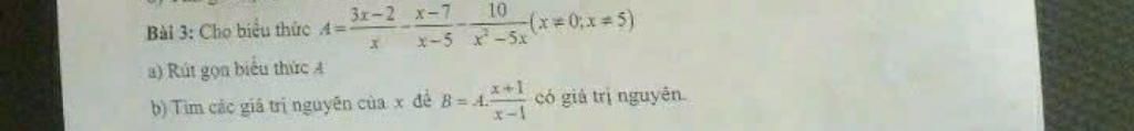`A=(3x-2)/x - (x-7)/(x-5) - 10/(x^2-5x)`.
