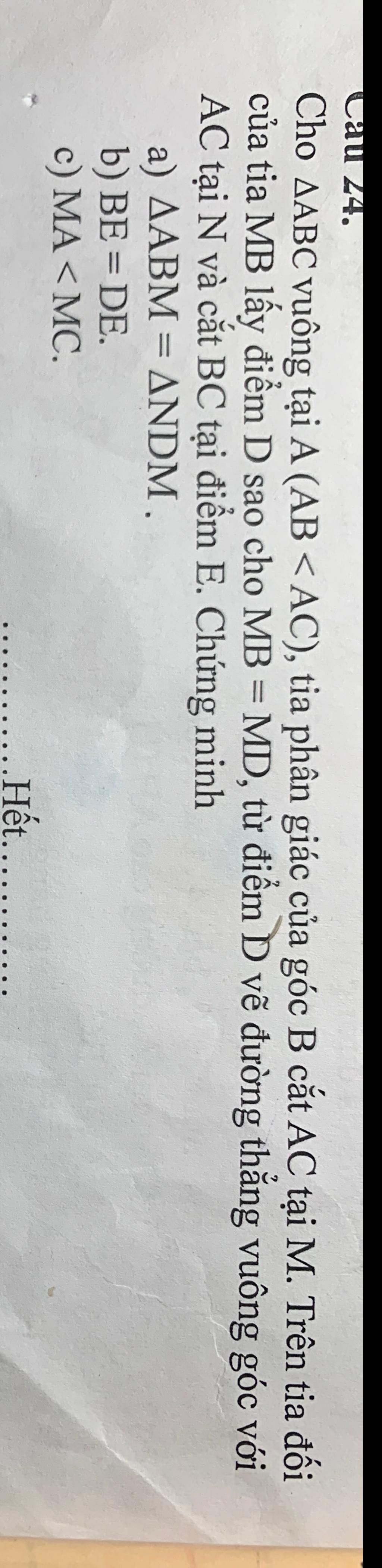 Vậy tam giác ABM=TAM GIÁC NDM ( CẠNH HUYỀN GÓC NHỌN )
