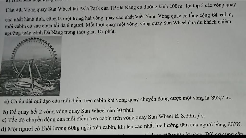 a) Chiều dài quỹ đạo của mỗi điểm treo cabin khi vòng quay chuyển động được 1 vòng là: