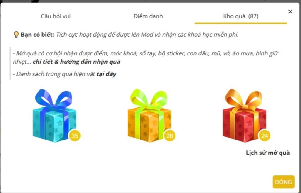 - Mở quà có cơ hội nhận được điểm, móc khoá, sổ tay, bộ sticker, con dấu, mũ, vở, áo mưa, bình giữ