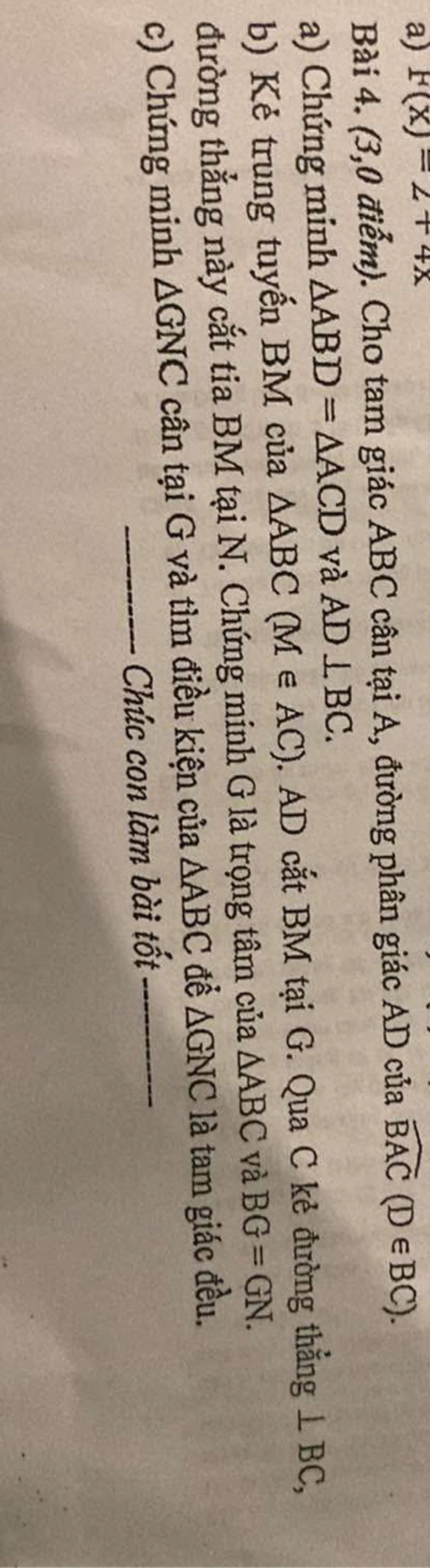 Bài 4. (3,0 điểm). Cho tam giác ABC cân tại A, đường phân giác AD của BAC (D =BC).