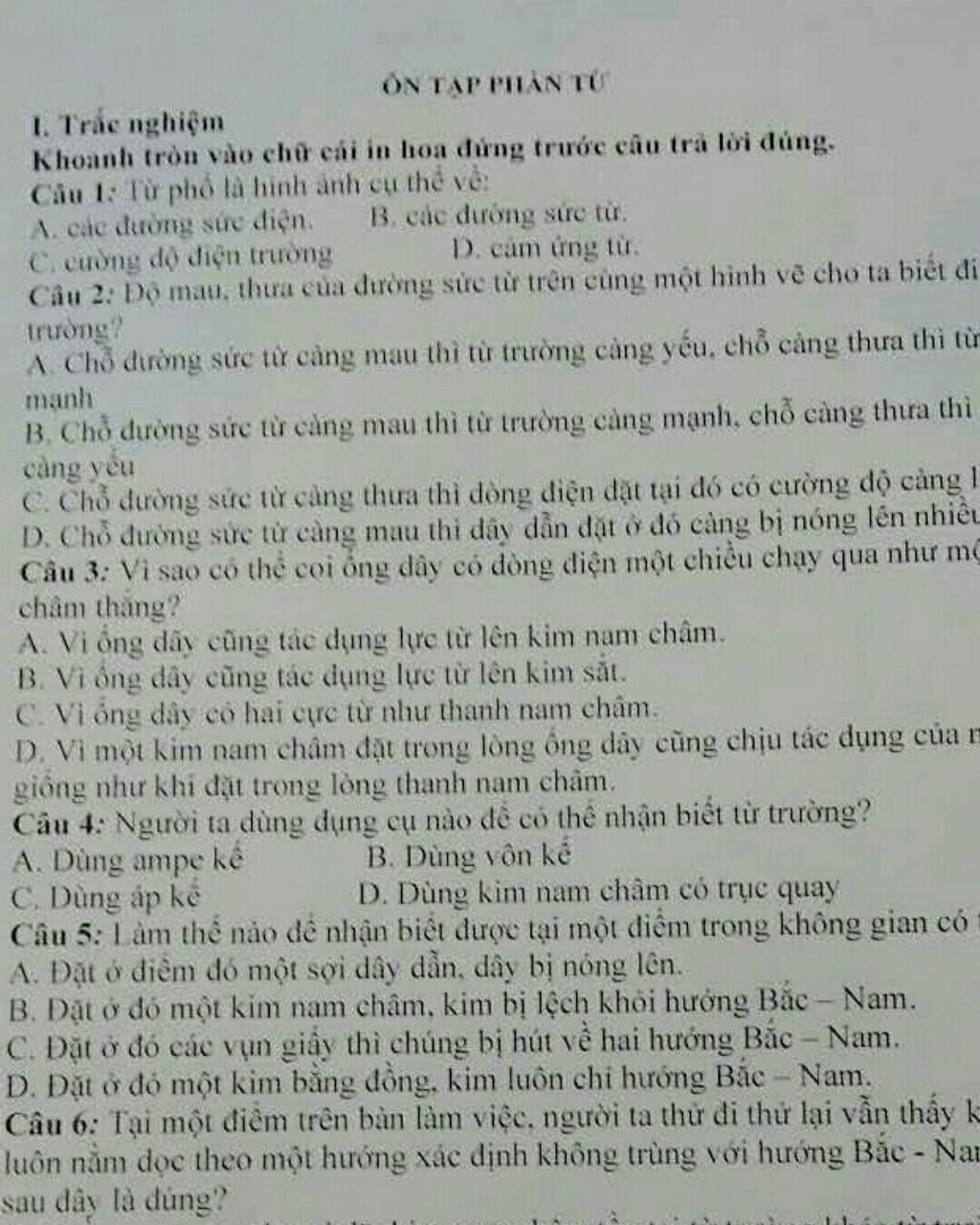 Câu 5: B. Đặt ở đó một kim nam châm, kim bị lệch khỏi hướng Bắc Nam.