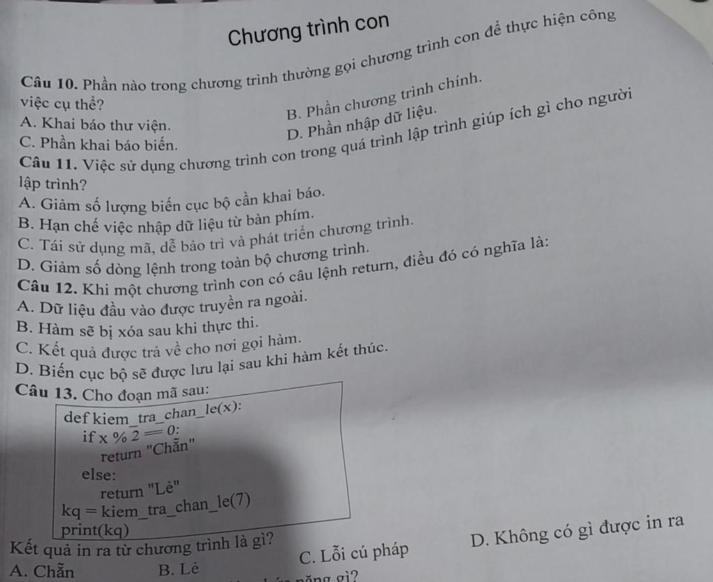 Câu 10. Phần nào trong chương trình thường gọi chương trình con để thực hiện công