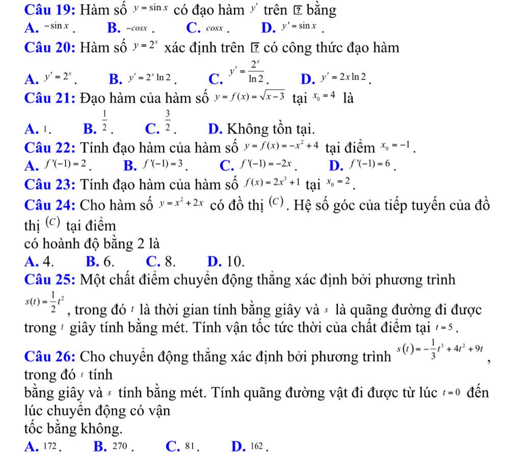 Câu 20: Hàm số y=2 xác định trên ữ có công thức đạo hàm
