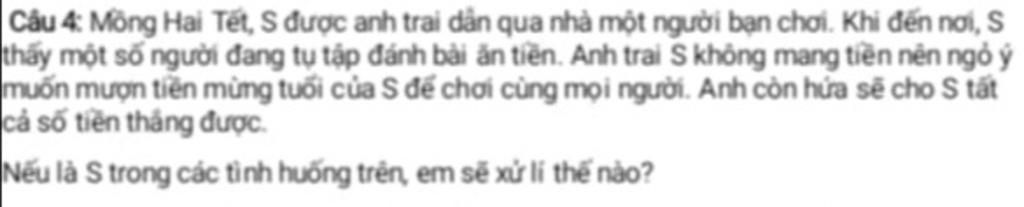 ` - ` Nếu là S trong tình huống trên , em sẽ từ chối không cho anh trai mượn tiền vì việc đánh bài ăn tiền là một hành vi vi phạm pháp luật, nhất là trong dịp Tết - là thời gian để sum họp và vui chơi lành mạnh. Em sẽ khuyên anh không nên tham gia, nếu anh trai vẫn tiếp tục muốn chơi thì em sẽ báo người lớn trong gia đình để can thiệp kịp thời