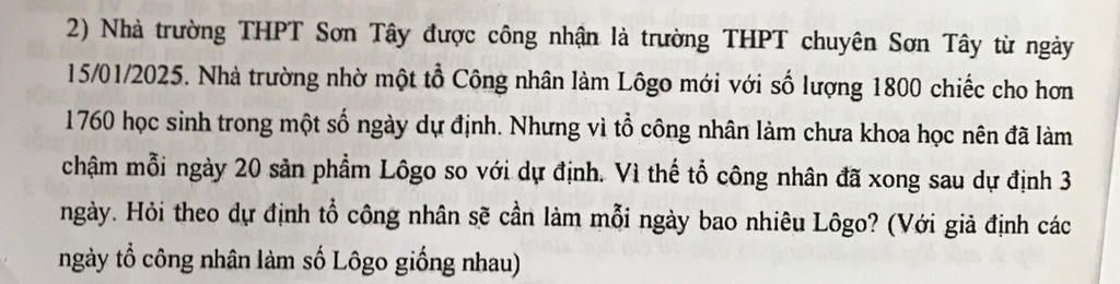Gọi số logo dự định làm mỗi ngày là x ( chiếc / ngày ) , và số ngày dự định là n . Vì phải làm tổng cộng là 1800 chiếc nên : x.n = 1800 => n = 1800/x