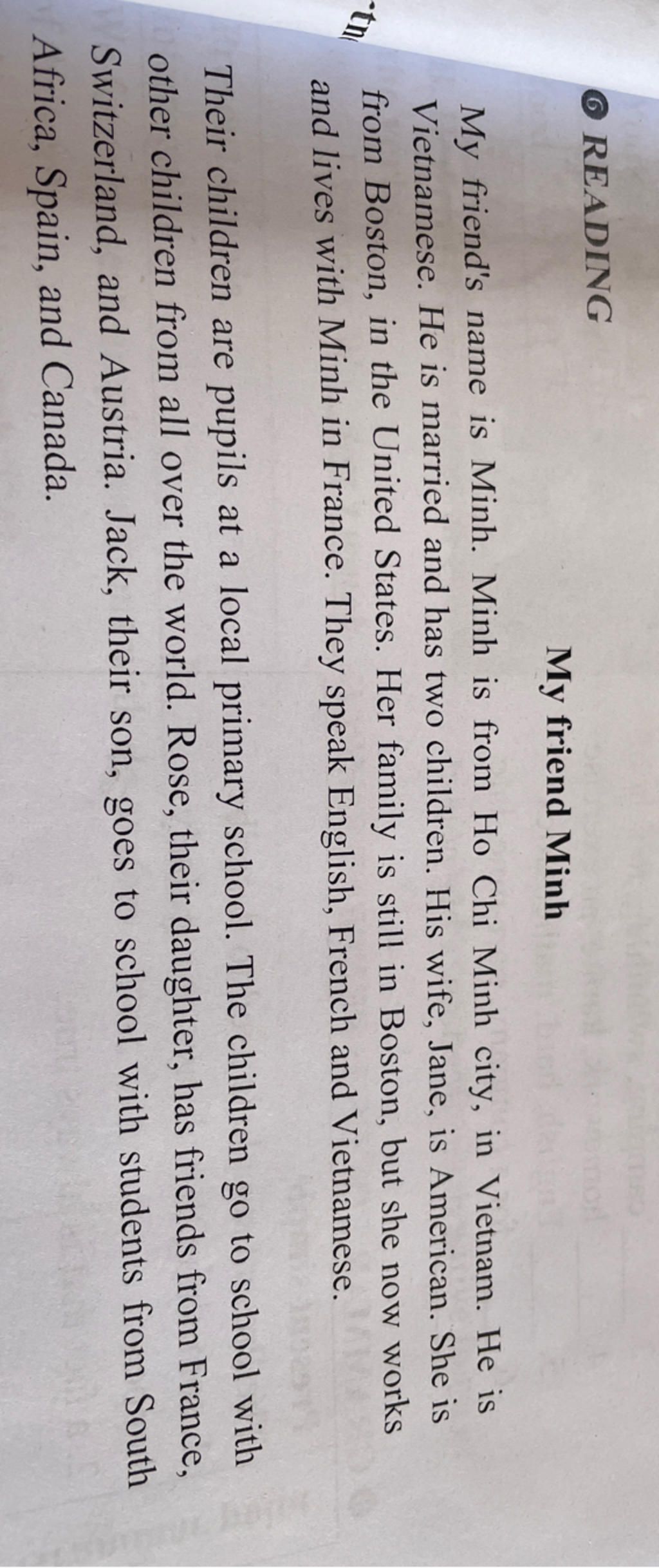 Bạn tôi tên là Minh. Minh đến từ thành phố Hồ Chí Minh, Việt Nam. Anh ấy là người Việt Nam. Anh ấy đã kết hôn và có hai người con. Vợ anh ấy, Jane, là người Mỹ. Cô ấy đến từ Boston, ở Hoa Kỳ. Gia đình cô ấy vẫn ở Boston, nhưng bây giờ cô ấy làm việc và sống với Minh ở Pháp. Họ nói tiếng Anh, tiếng Pháp và tiếng Việt. Các con của họ là học sinh tại một trường tiểu học địa phương. Những đứa trẻ đi học với những đứa trẻ khác từ khắp nơi trên thế giới. Rose, con gái của họ, có bạn bè từ Pháp, Thụy Sĩ và Áo. Jack, con trai của họ, đi học với các bạn học sinh đến từ Nam Phi, Tây Ban Nha và Canada.