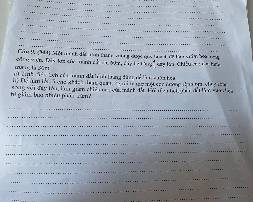 `a.` Tính `S` hình thang dùng làm vườn hoa.