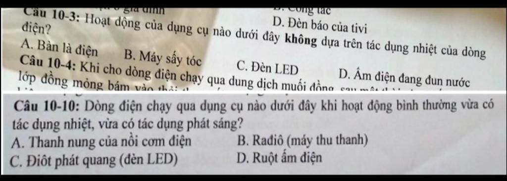 + Bàn là điện, máy sấy tóc và ấm điện đều hoạt động dựa trên tác dụng nhiệt của dòng điện để làm nóng, còn đèn LED phát sáng là dựa trên công nghệ bán dẫn.
