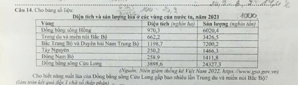 Câu `\bb 14:` Năng suất lúa của Đồng bằng sông Cửu Long gấp số lần Trung du và miền núi Bắc Bộ
