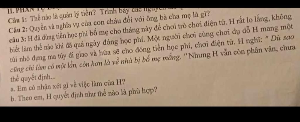 b) theo em, trước tiên H không nên sử dụng hết tiền học phí bố mẹ cho để chơi trò chơi điện tử . Cuối cùng H cũng tuyệt đối không bao giờ được làm những hành vi vi phạm pháp luật như hành vi giao hàng cấm