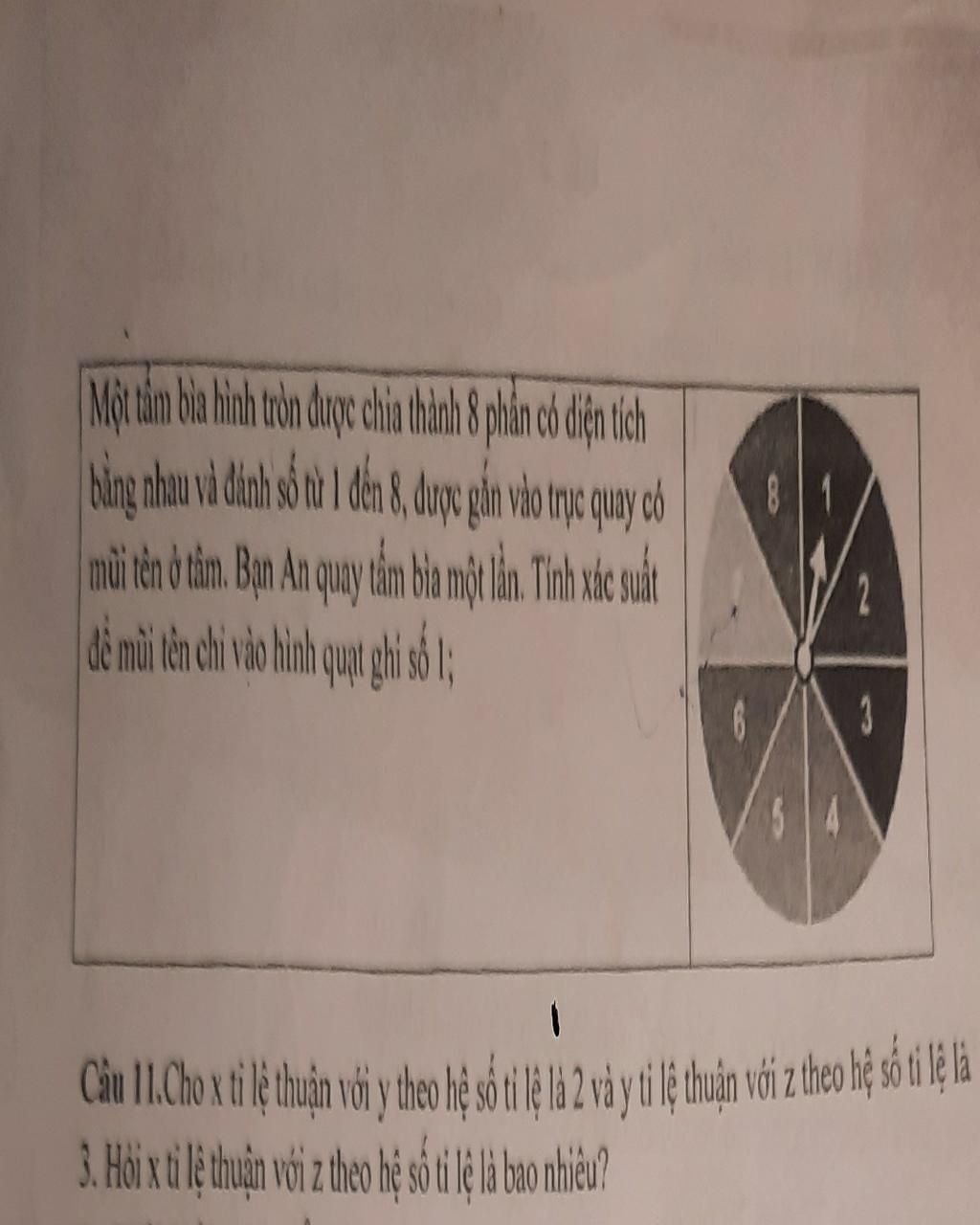 Vì có `8` phần bằng nhau mỗi phần được đánh một số khác nhau từ `1->8`. Do đó xác suất để mũi tên chỉ vào hình quạt ghi số `1` là: `1/8`